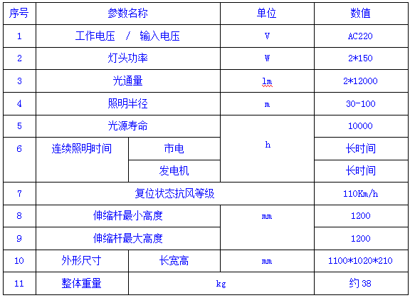 車載移動(dòng)照明設(shè)備供電設(shè)備:選用220v電源或發(fā)電機(jī)供電,可連續(xù)長時(shí)間照明使用。