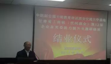 27日下午,研修班舉行了結(jié)業(yè)儀式。中組部全國(guó)干部教育培訓(xùn)西安交通大學(xué)基地主任羅能勤,對(duì)研修班全體成員順利結(jié)業(yè)表示了熱烈的祝賀;省工商聯(lián)黨組成員、副主席陳昊向西安交通大學(xué)干部培訓(xùn)基地表達(dá)了誠(chéng)摯的感謝。