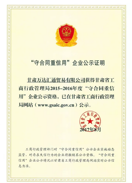 日前,甘肅省工商行政管理局對2015年—2016年度“守合同重信用企業(yè)”進(jìn)行了公示。甘肅泰和實業(yè)(集團(tuán))有限公司旗下甘肅萬達(dá)匯通貿(mào)易有限公司(以下簡稱“萬達(dá)匯通”)憑借良好的企業(yè)信譽(yù),獲得了2015年—2016年度甘肅省“守合同重信用”企業(yè)榮譽(yù)稱號。