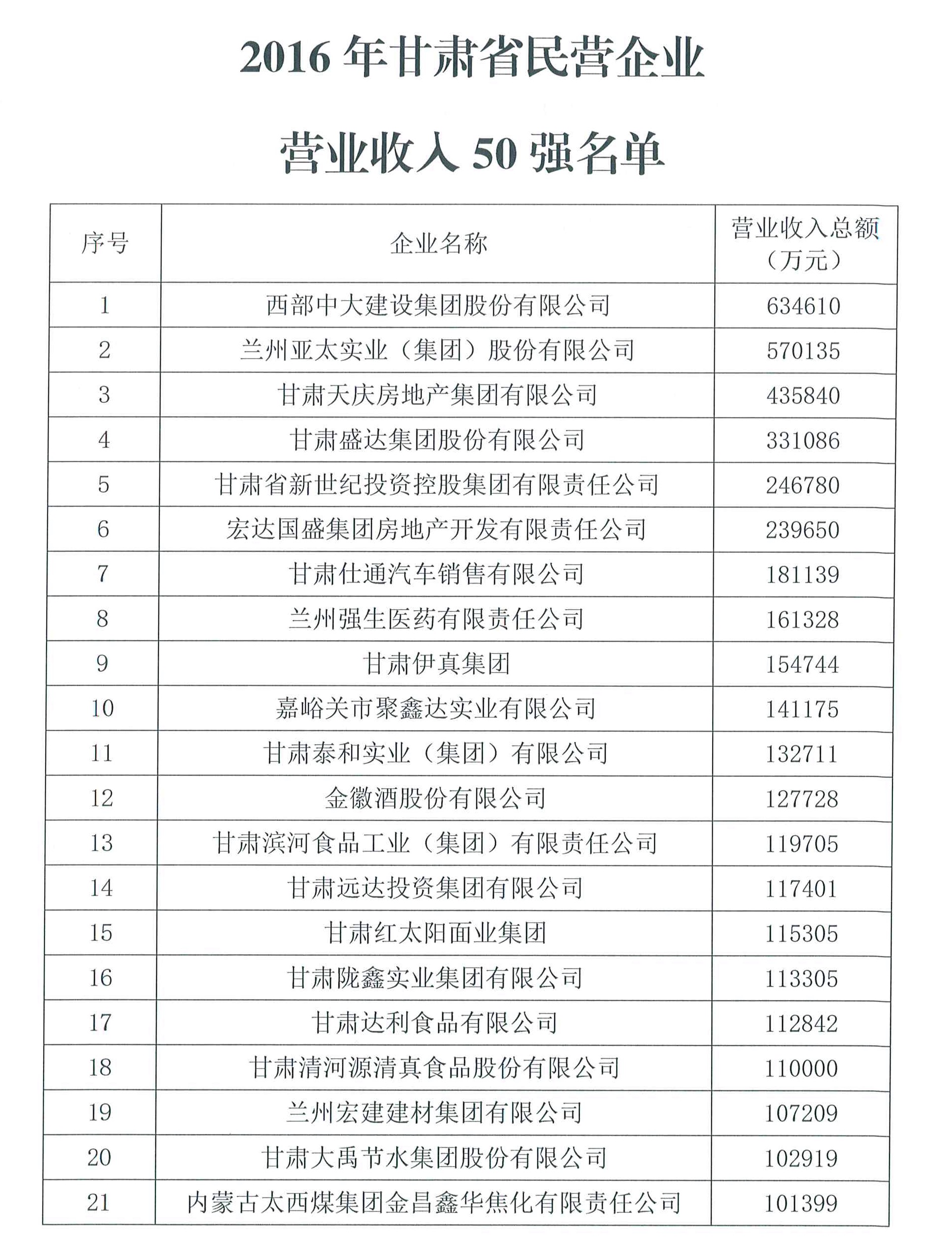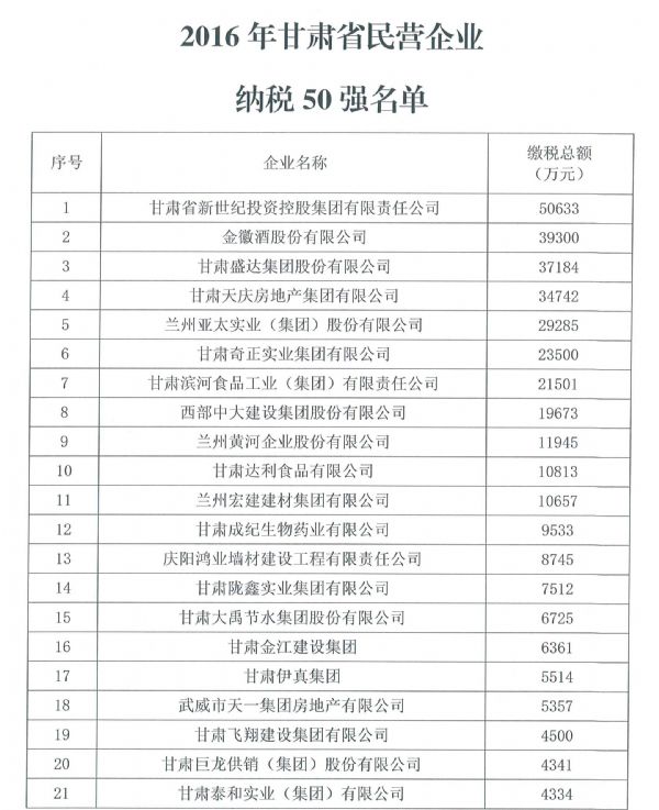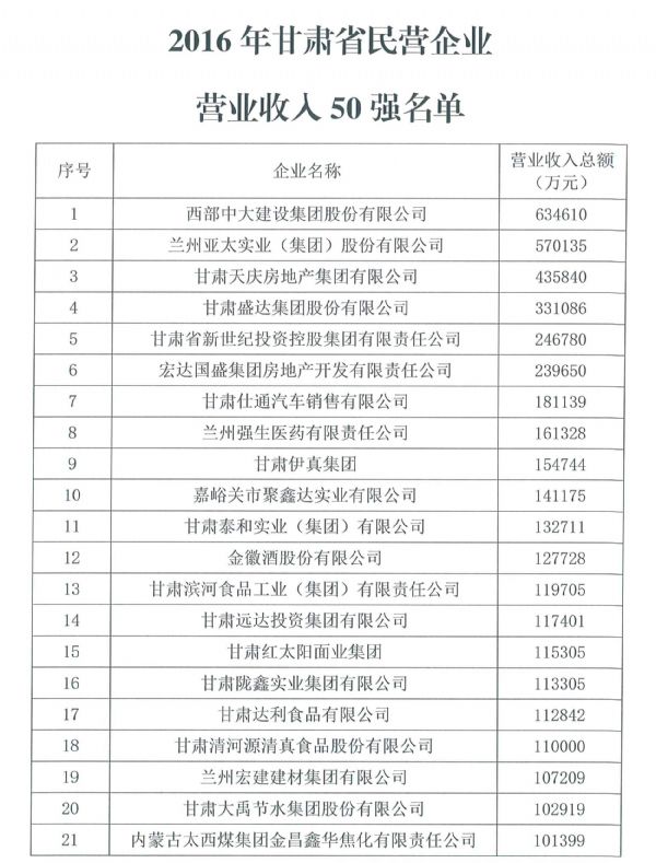據(jù)了解,2017年2月至5月,甘肅省工商聯(lián)組織力量,結(jié)合全國(guó)工商聯(lián)民營(yíng)企業(yè)上規(guī)模調(diào)研活動(dòng),在全省范圍內(nèi)開(kāi)展了2016年度營(yíng)業(yè)收入1000萬(wàn)元以上民企的深度調(diào)研工作。調(diào)研采取廣泛宣傳、組織動(dòng)員、企業(yè)申報(bào)、自上而下、相關(guān)部門(mén)推薦的方法進(jìn)行,基本掌握了上規(guī)模民企的基本情況,共收到有效調(diào)查數(shù)據(jù)表360份,經(jīng)過(guò)數(shù)據(jù)分析、核實(shí)報(bào)表、查驗(yàn)憑證、評(píng)估評(píng)審,共評(píng)選出了2016年度甘肅省民營(yíng)企業(yè)營(yíng)業(yè)收入50強(qiáng)、納稅50強(qiáng)和安置就業(yè)50強(qiáng)。