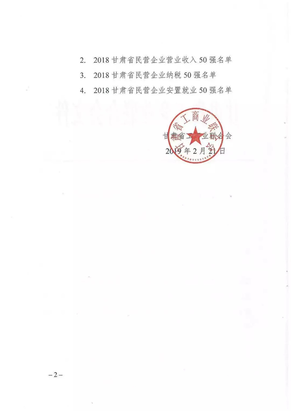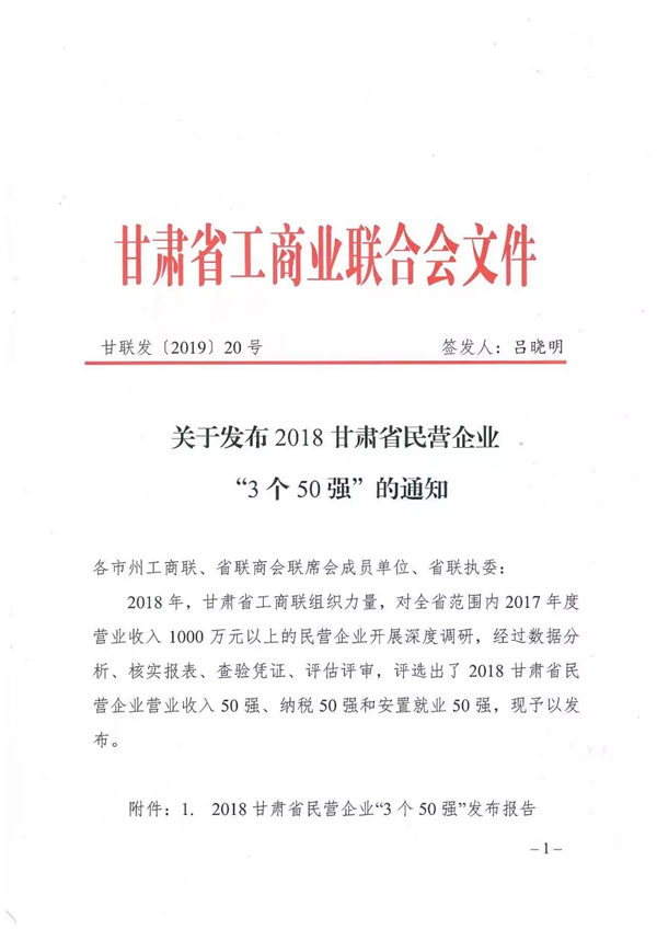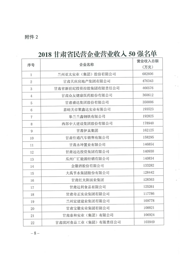 甘肅泰和實(shí)業(yè)(集團(tuán))有限公司榮登2018甘肅省民營(yíng)企業(yè)營(yíng)業(yè)收入50強(qiáng)榜單