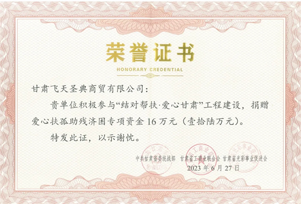 甘肅飛天圣典商貿(mào)有限公司熱衷公益事業(yè),履行社會責(zé)任,傳遞公益正能量,積極開展慈善扶貧、助學(xué)等活動(dòng),用實(shí)際行動(dòng)踐行公益。今后,公司將繼續(xù)在助推鄉(xiāng)村振興、扶危濟(jì)困、助學(xué)助弱等方面發(fā)揮積極作用,為我省公益事業(yè)發(fā)展貢獻(xiàn)力量。